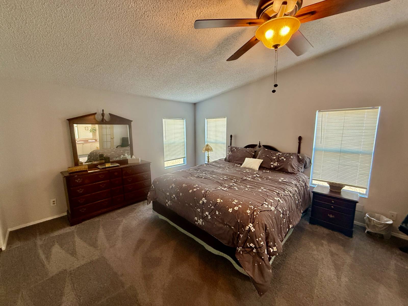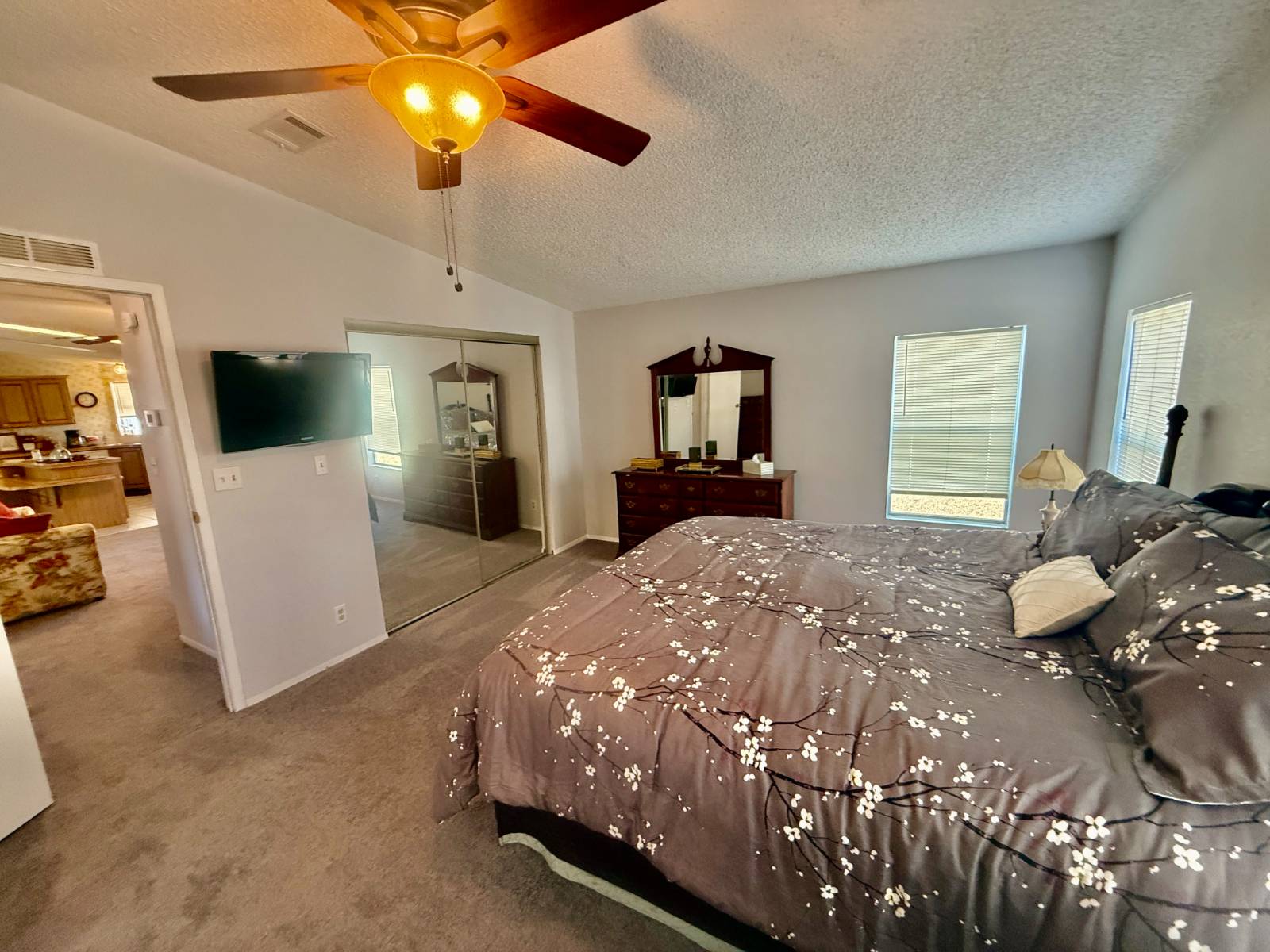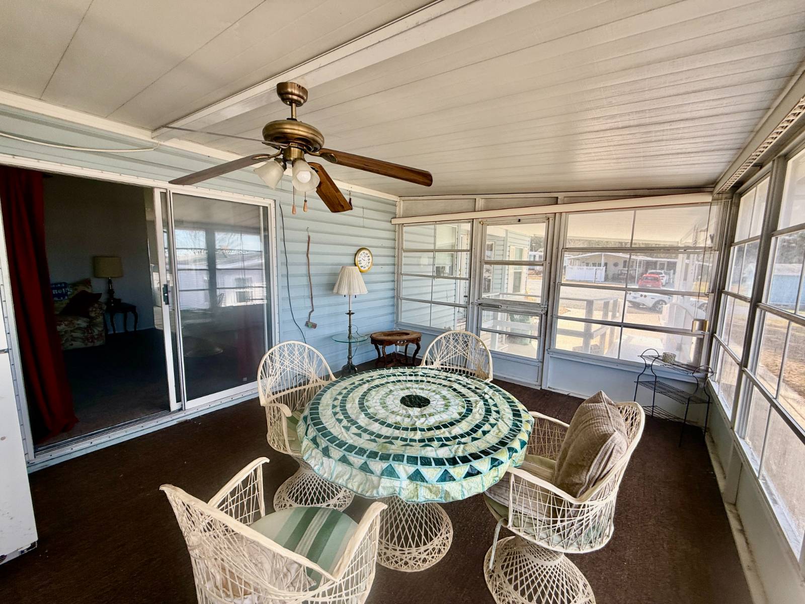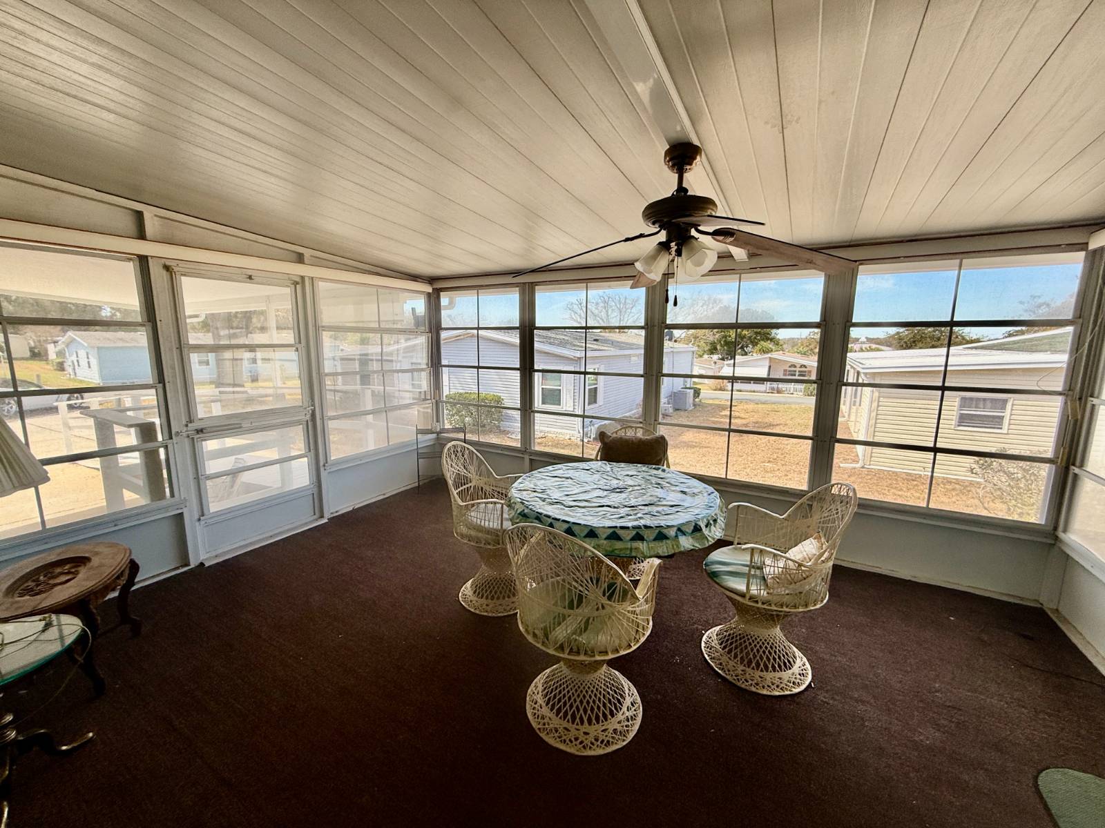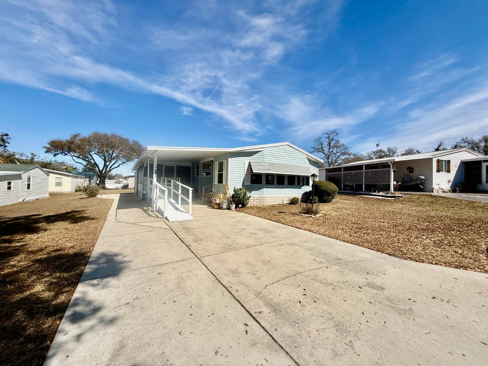 Home is located in Water Oak Country Club Estates, an active 55 plus resort style, land lease community in Lady Lake Florida. Conveniently located near the main front entrance and the sports complex, as well as the main clubhouse and amenities. Situated on a quiet cul de sac. Driveway provides ample parking with an extra golf cart driveway as well. The utility shed is great for storage. A handicap ramp is already installed but can be removed. A/C/Heat pump has been replaced within last 5 years. Open kitchen design has plenty of cupboard and counter space, including a large pantry. All appliances convey. Stovetop in the island, which also provides additional seating as well as a wall mounted oven. Beautiful ceramic tile floors in dining room as well and a attractive built in hutch. The large living room has panoramic windows which provide plenty of natural light with brand new high quality carpet. An extra den area could be used for a sitting area or a spot for an extra television. Built in cabinets for extra storage. Sliding glass doors lead out to the enclosed lanai. Indoor laundry for convenience. The guest bedroom has an ensuite bathroom as well as access off laundry area. tub shower combo. The primary bedroom is large with a walk in closet. The ensuite bath has a soaker tub and a walk in shower. This is a spacious home, priced to sell! Lot rent includes land lease, 24 hour staffed main gate, lawn mowing and all resort style amenities, except for golf. All residents and their guests receive a discount to play golf. Amenities include an outdoor sports complex, 2 clubhouses, 2 pools with a 3rd brand new pool just completed, walking trails, dog parks, catch and release fishing, 24 hour fitness center and so much more! Call to tour this beautiful home today!
